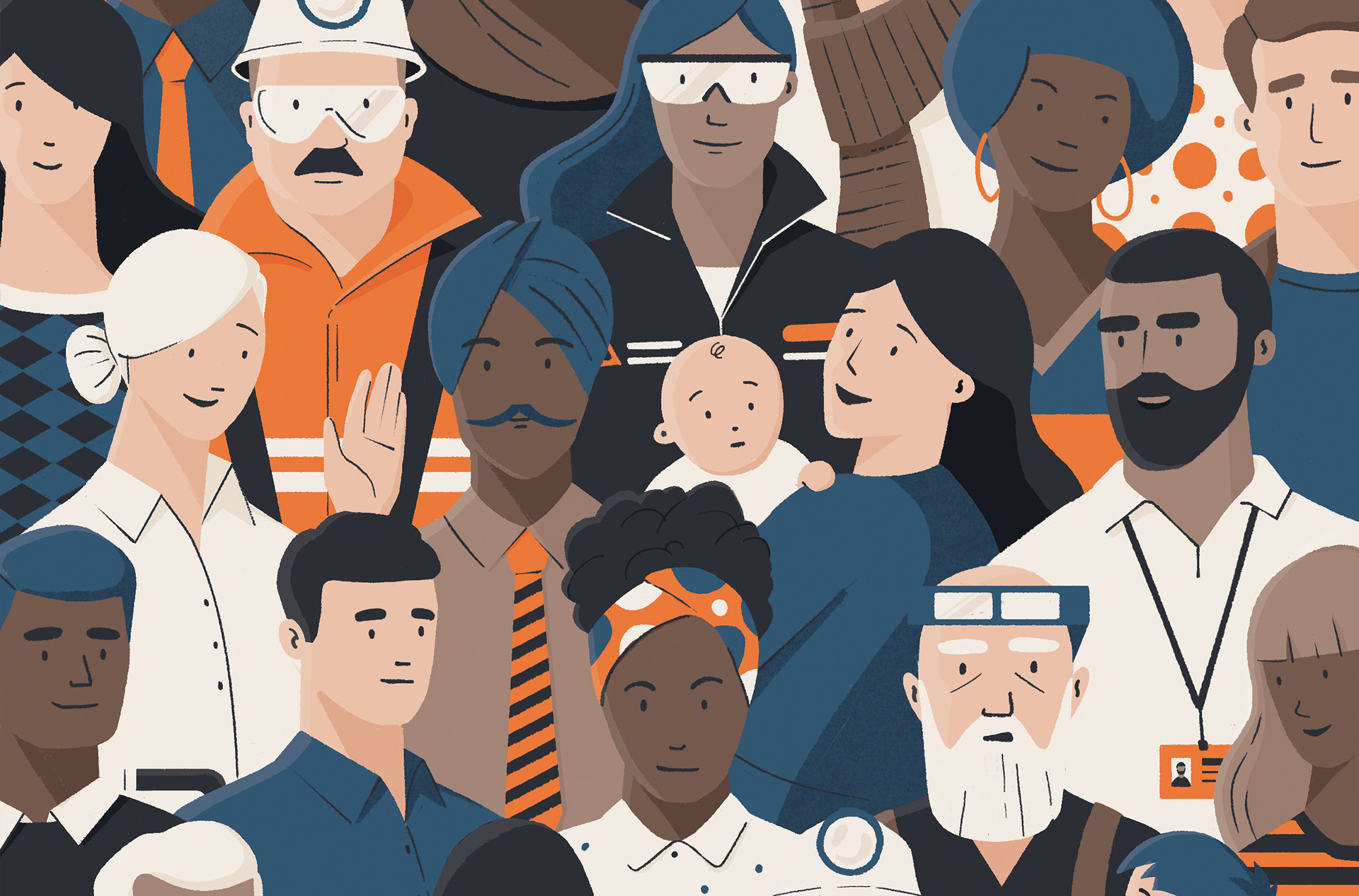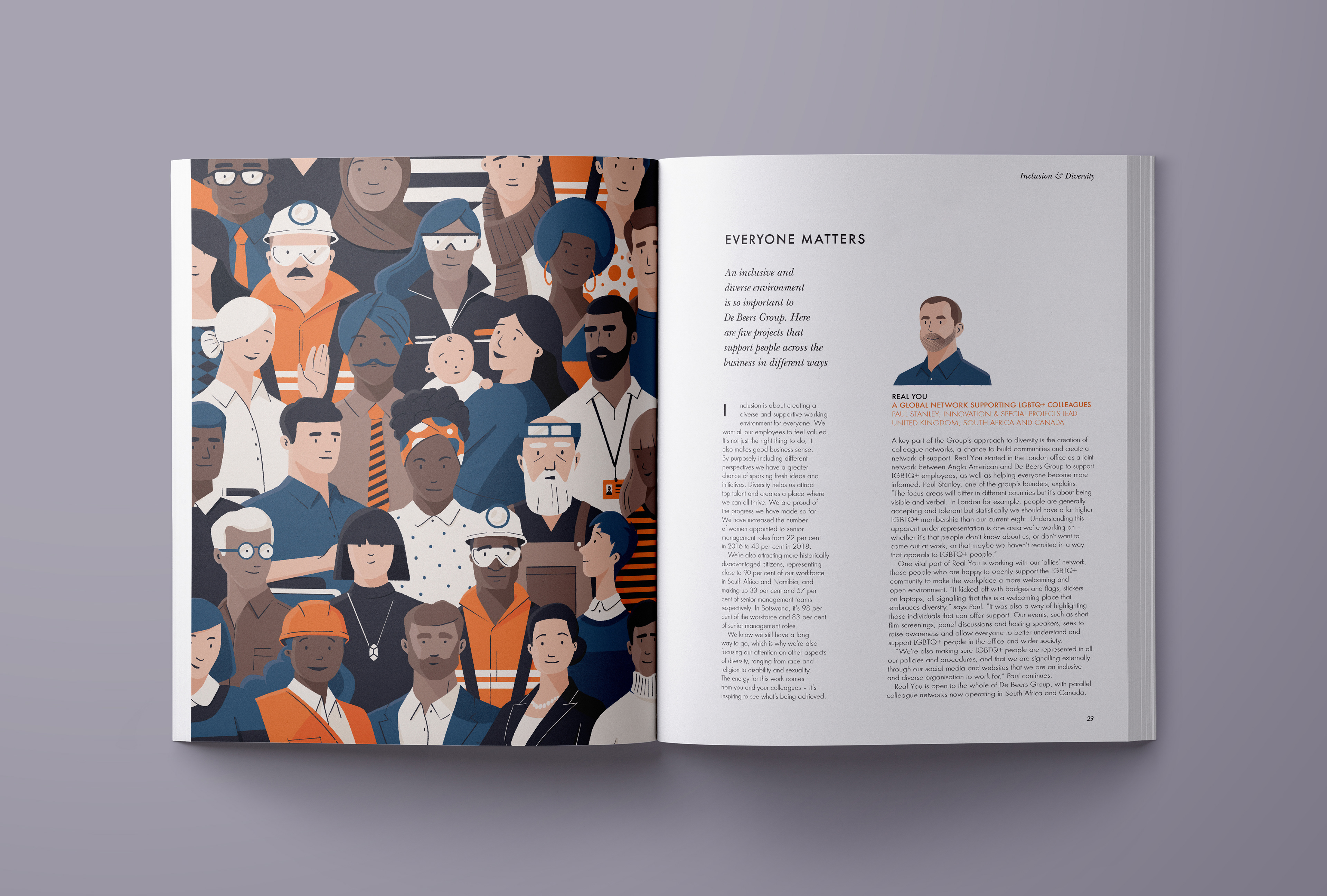 Full-page illustration and headshots for Pursuit, an internal employee magazine for De Beers Group.